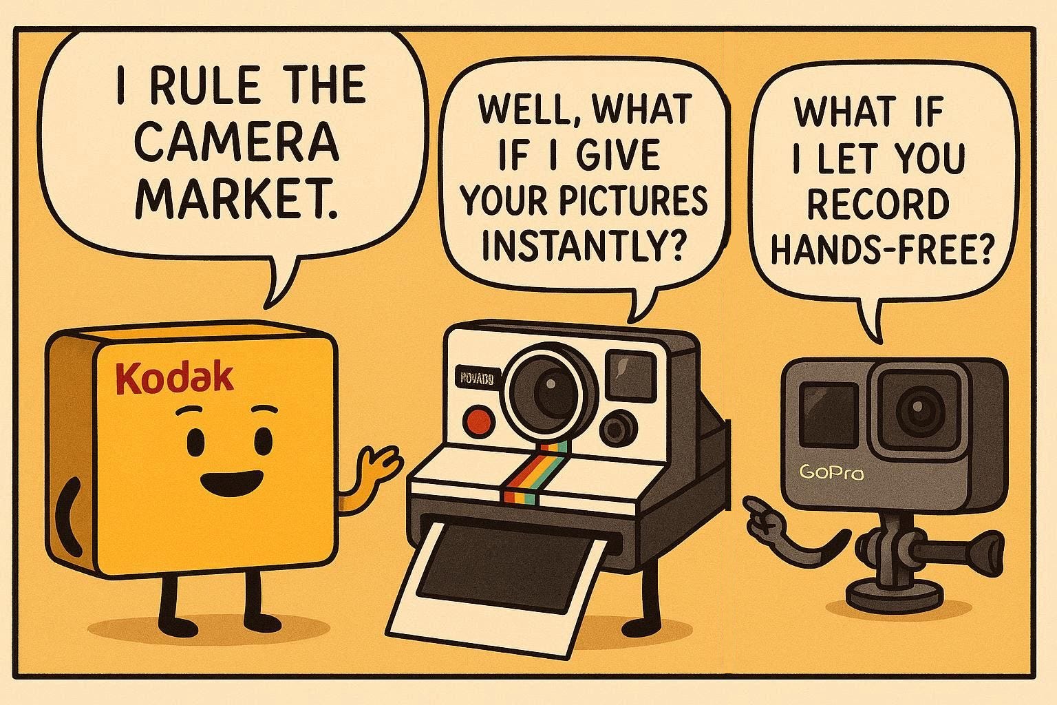 When Kodak ruled the camera market, Polaroid said, “We’ll give you photos instantly.” Years later, some people realized Kodak cameras weren’t suited for every situation — especially for action. That’s when GoPro appeared and said, “We’ll let you record hands-free.”